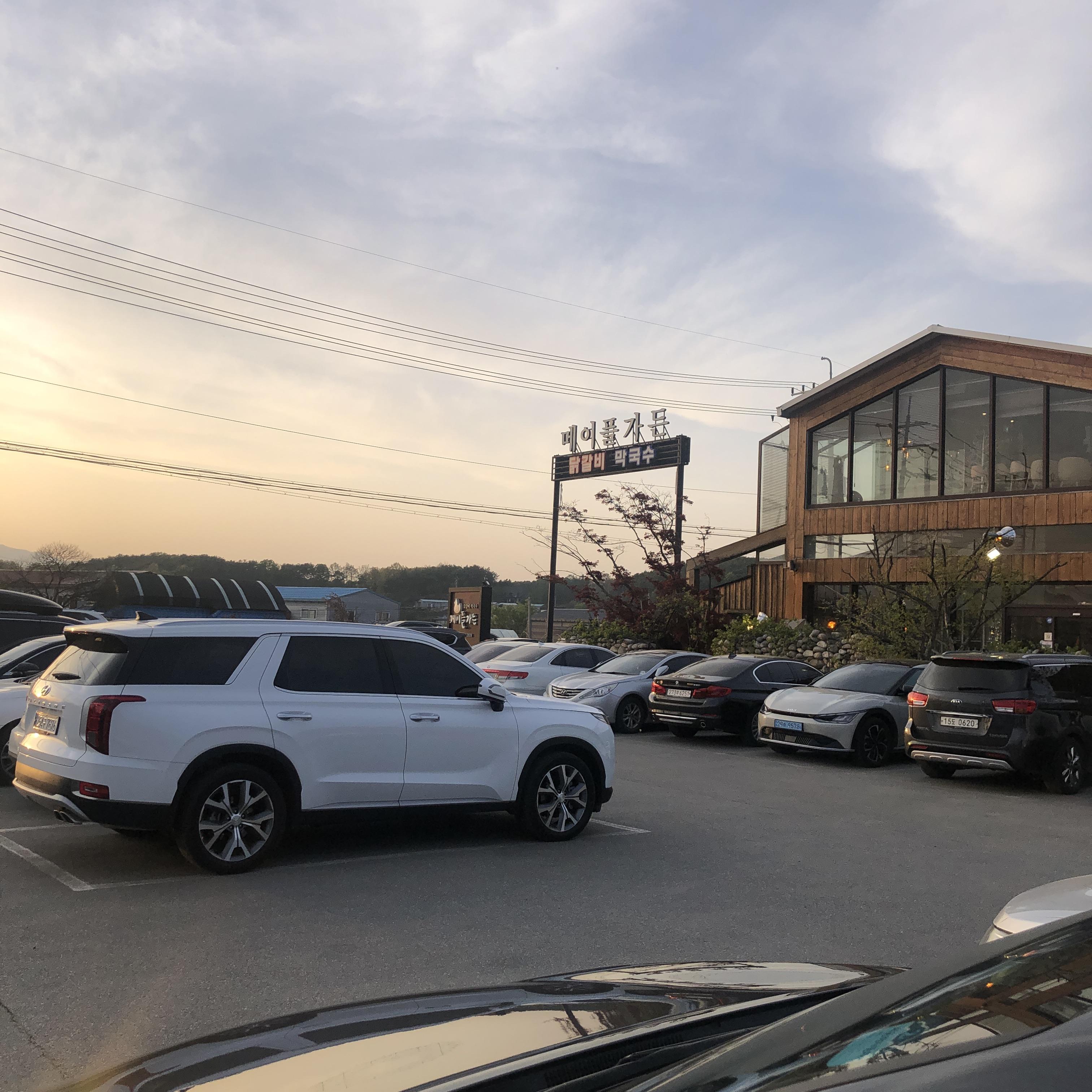 메이플가든 닭갈비 주차장에서 한 컷 찍었습니다. 많은 차량들이 주차되어 있는 것을 확인할 수 있습니다.