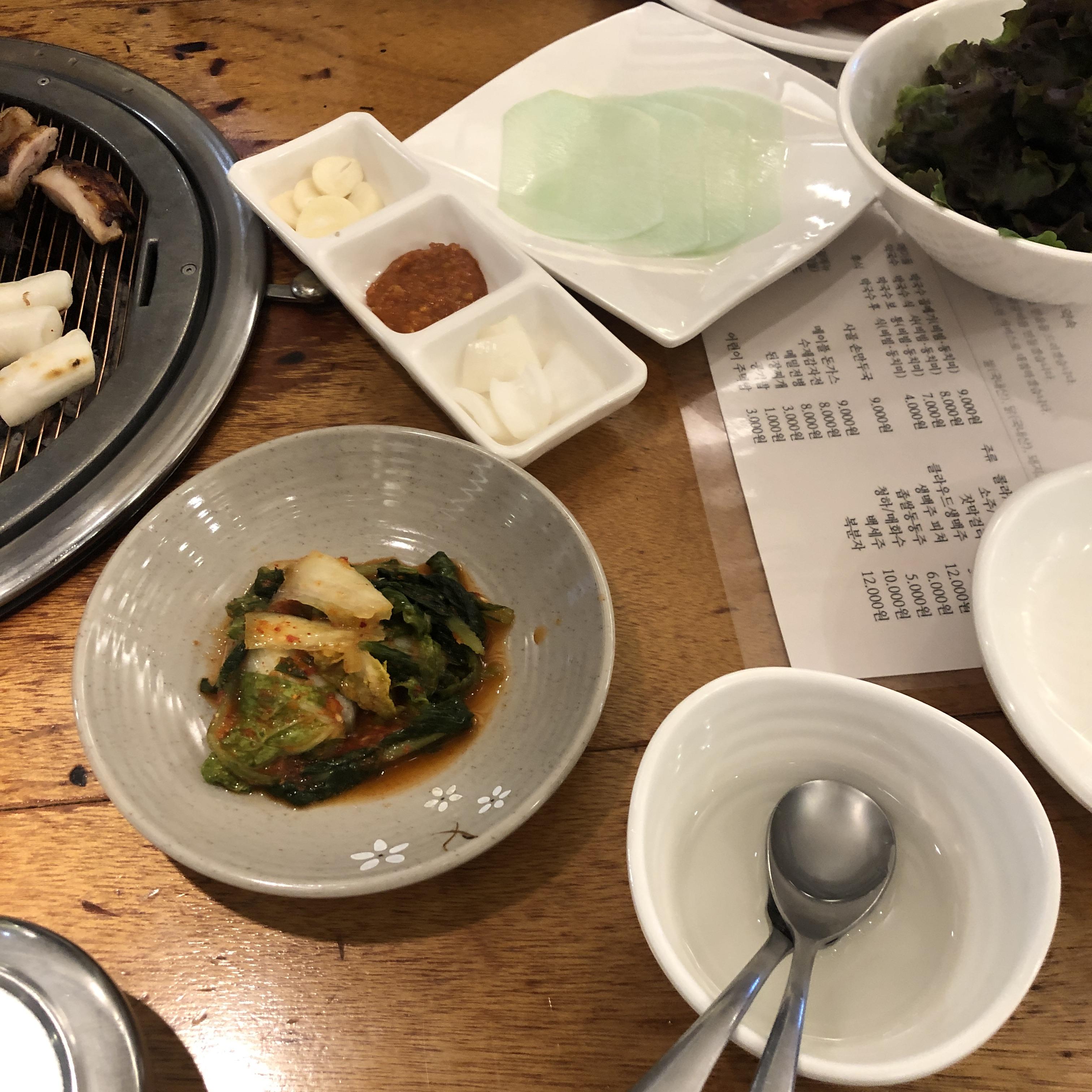 밑반찬은 깔끔하게 야채와 쌈무, 그리고 동치미가 나옵니다. 그리고 공기밥과 함께 김치가 나옵니다.