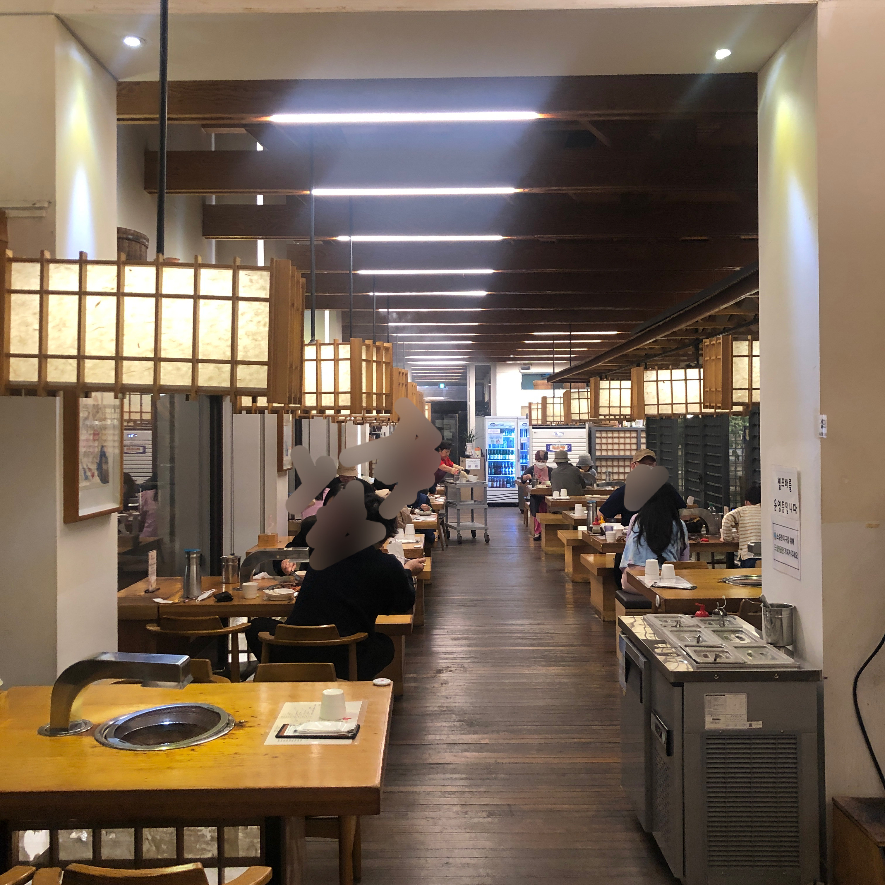 테이블에 연기 흡입기도 설치가 되어 있어서, 사진에서 보시는 것처럼 홀 안에 연기가 많이 차지 않았습니다. (물론 연기가 아예 없지는 않았습니다.) 실내 등 역시 창호지로 만들어져서 분위기를 살려 주었습니다.