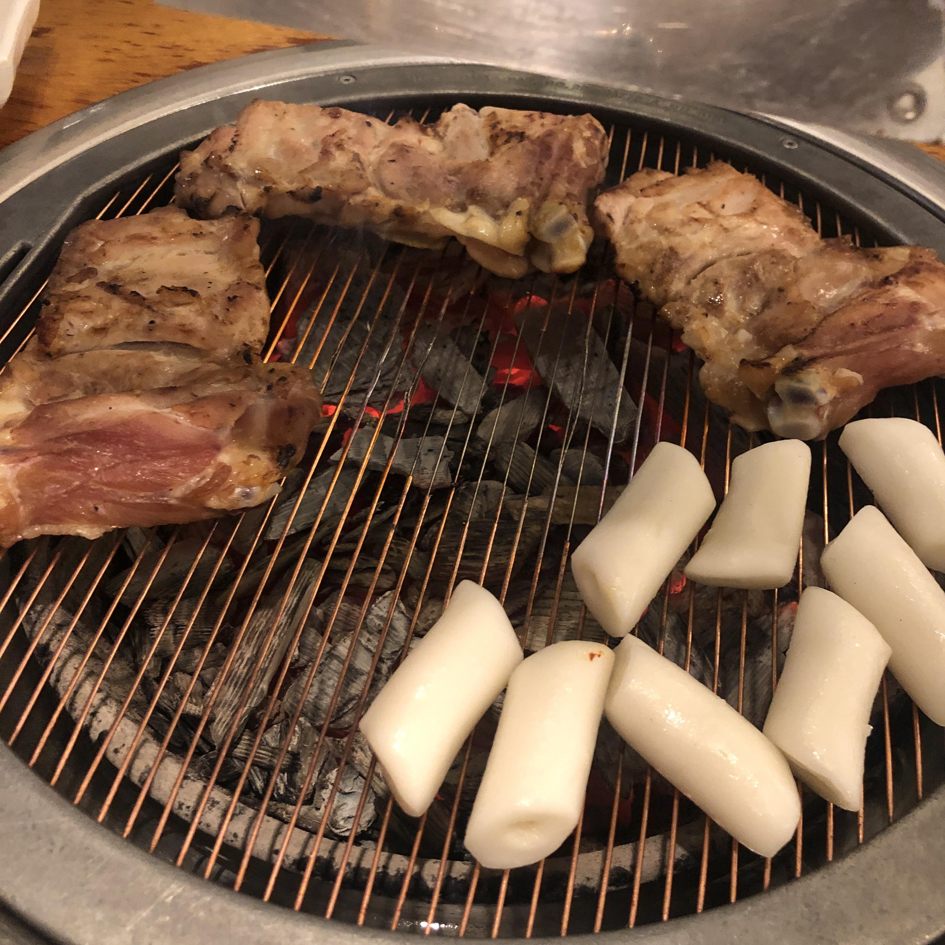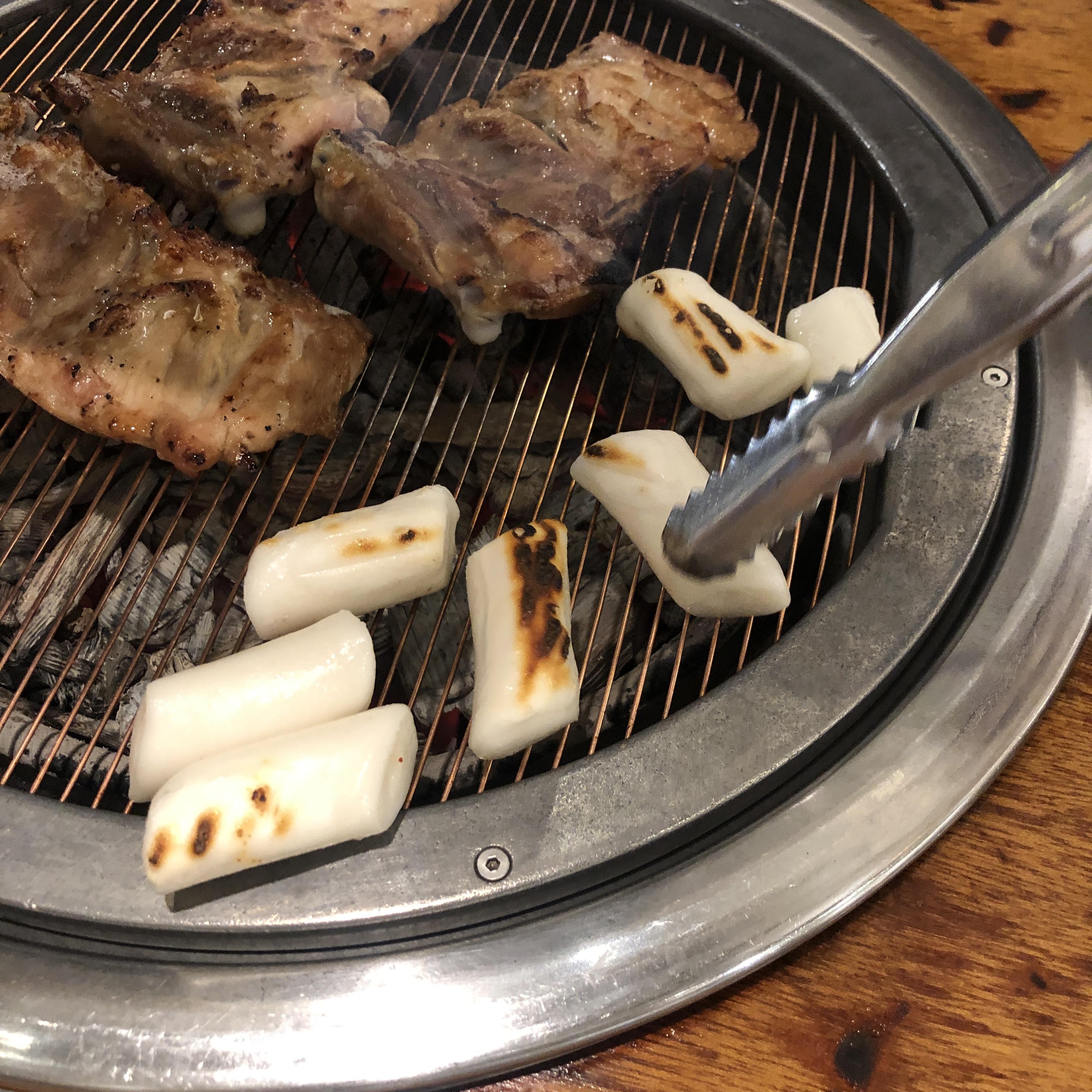 따로 사이드나 토핑을 추가하진 않았는데, 가래떡이 토핑으로 추가됩니다. 점원이 구워주지는 않고, 저희가 직접 구웠습니다.