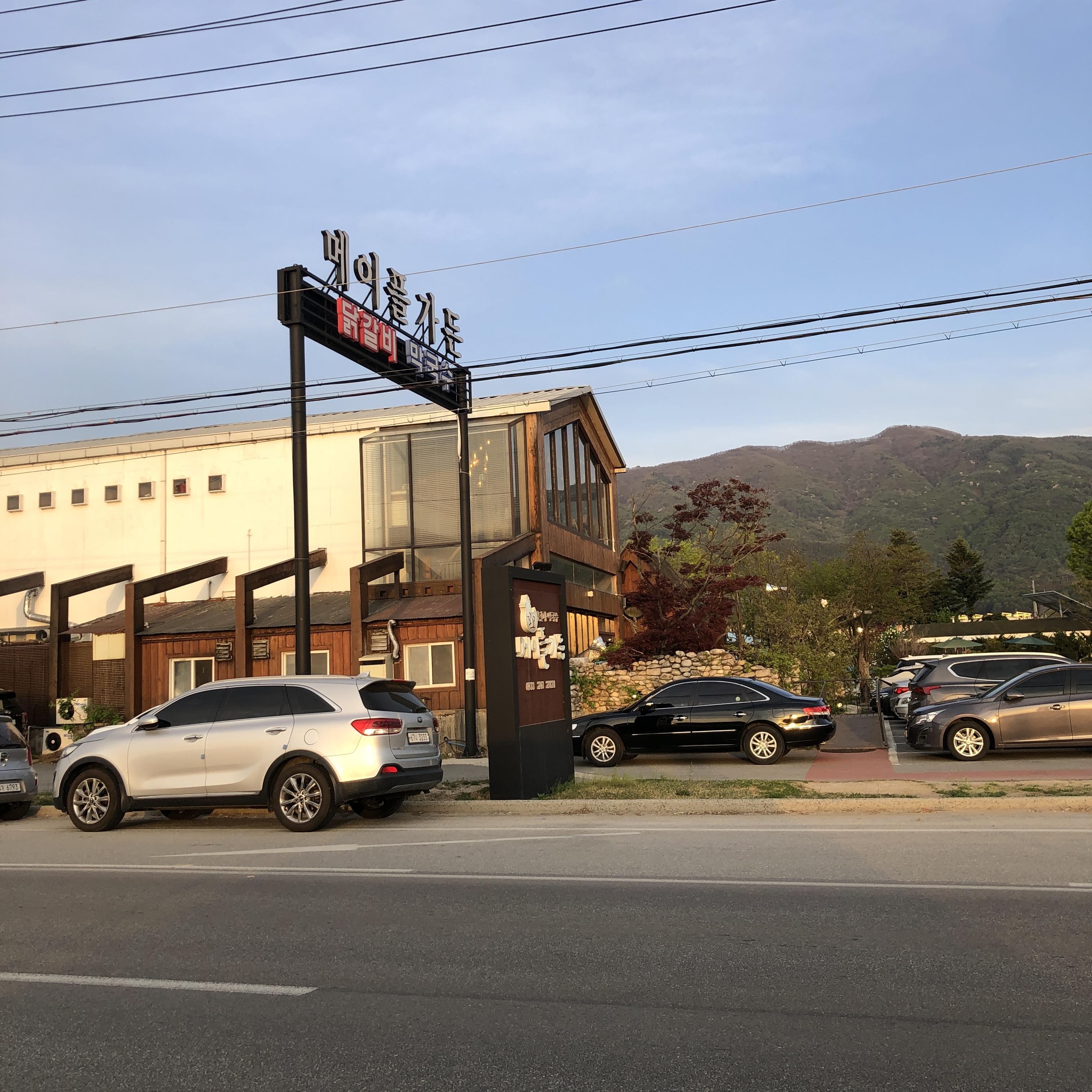 춘천 애니메이션스튜디오에서 네비게이션을 따라 약 30분 정도 이동하면 메이플가든 닭갈비에 도착을 합니다. 메이플가든 닭갈비에서 유턴하기 위해 신호를 기다리면서 사진을 한 컷 찍었습니다. 주자창이 상당히 넓어서 주차 공간은 충분합니다. 몇몇 고객들은 길가에 그냥 주차를 하기도 합니다.