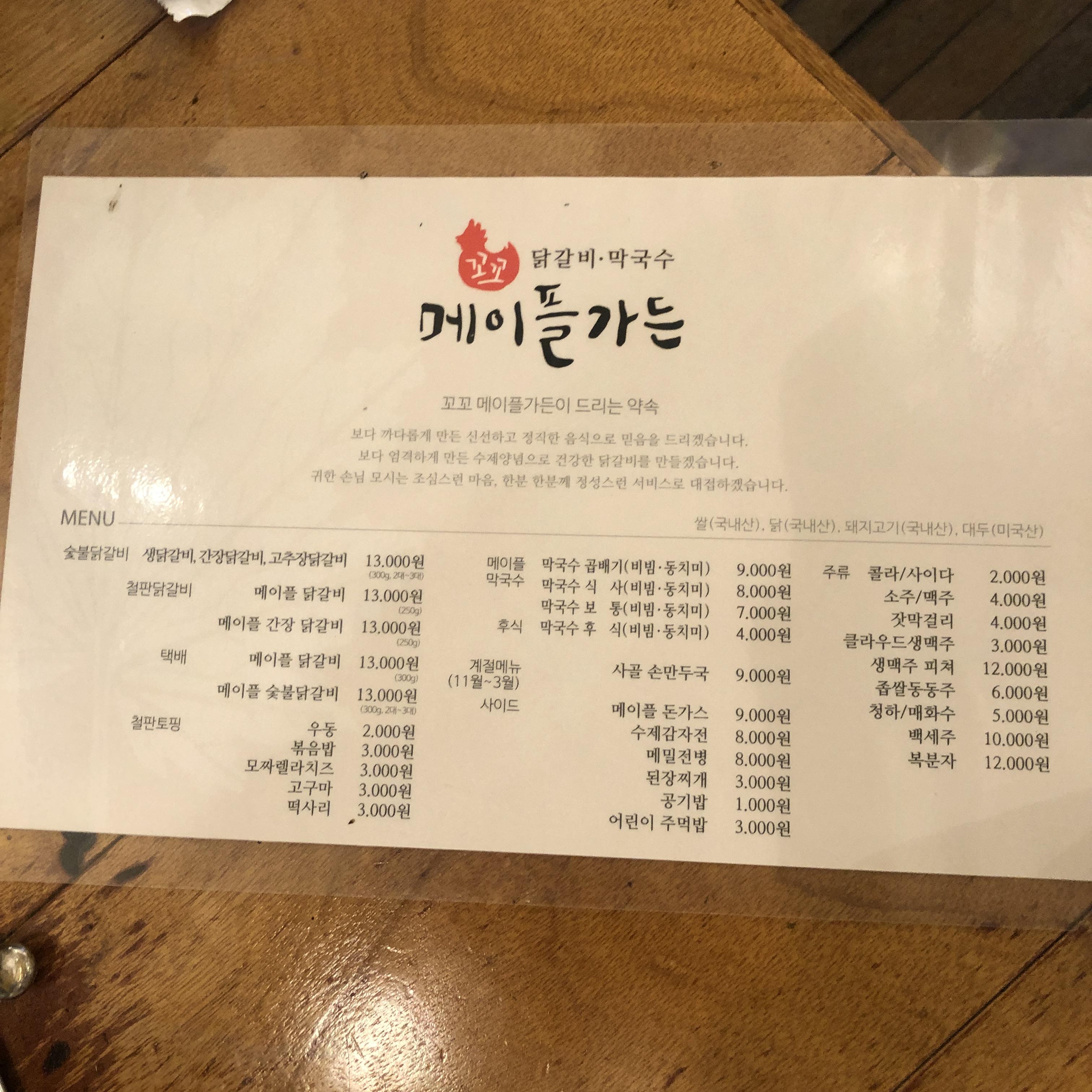 메이플가든 닭갈비 메뉴판입니다. 춘천에서 먹는 춘천닭갈비 가격인데도 많이 비싸다는 느낌은 들지 않았습니다.