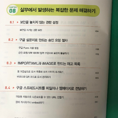 정말 챕터 8을 보았을 때, 진짜 이분은 실무에서 스프레드시트를 엄청나게 활용하시는구나라는 생각이 들었습니다. 저는 비록 이런 기능들을 지난 6년동안 한번도 사용하지 않았지만, 이런 기능들이 있으면 좋겠다라고 생각하거나 그냥 지나치기만 했던 기능들을 꼼꼼하게 제시하고 있습니다. 특히 독자들이 바로 실전에서 도움이 될 수 있도록 실무에서 발생하는 복잡한 문제 상황을 제시하고, 그것을 해결할 수 있는 구체적인 방안들을 제시하고 있습니다.