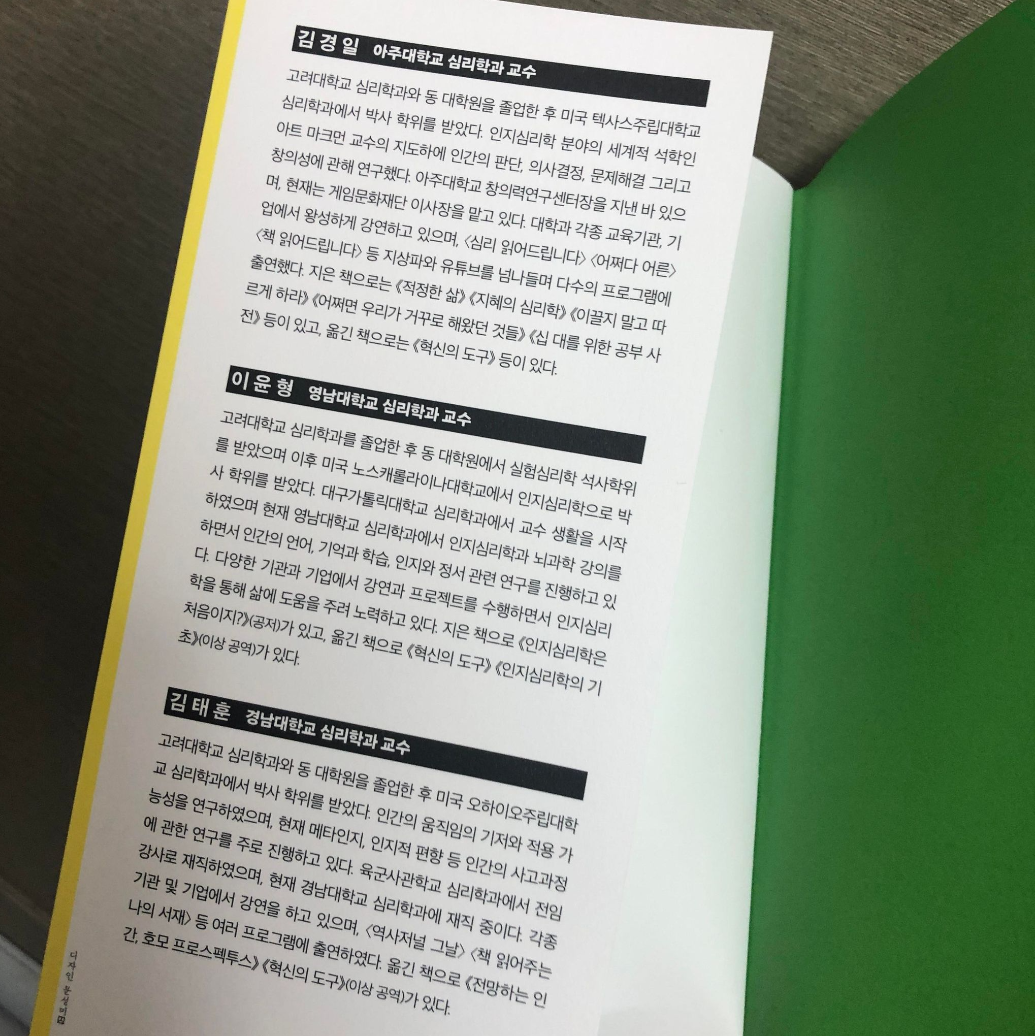 게다가 이번에는 김경일 교수님만 참여한 것이 아니라 이윤형 교수님과 김태훈 교수님이 저자로 함께 참여를 했습니다. 이 세 분 교수님은 각각 아주대, 영남대, 경남대 심리학과 교수로 재직 중인데요. 각각 다른 대학의 교수인데 어떻게 연결되는지를 살펴보면 상당히 흥미롭습니다. 바로 이 세 분은 모두 고려대 심리학과와 동 대학원을 졸업했고, 모두 미국에 심리학 박사 학위를 취득했습니다. 이런 공통점으로 연결되어 있는 교수님이라 <이그노벨상 읽어드립니다>는 더욱 깊이 있으면서도 다양한 주제를 다루고 있습니다.