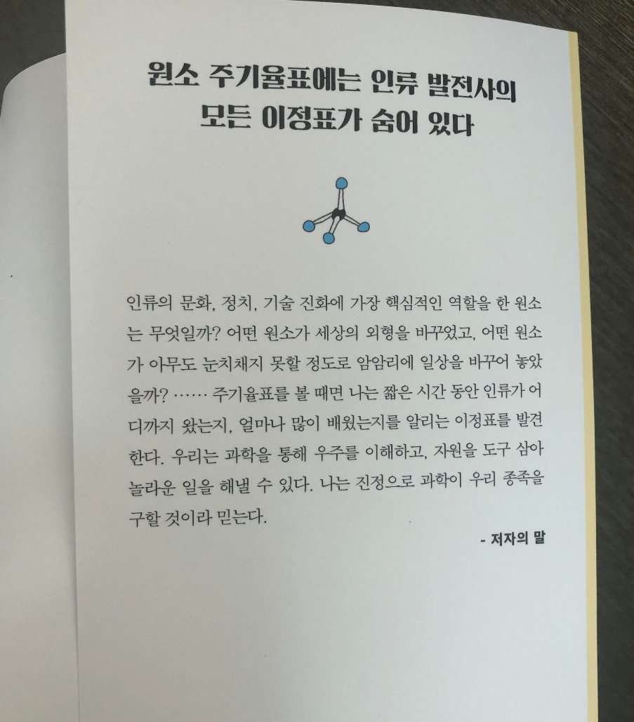주기율표를 볼 때면 나는 짧은 시간 동안 인류가 어디까지 왔는지, 얼마나 많이 배웠는지를 알리는 이정표를 발견한다. 우리는 과학을 통해 우주를 이해하고, 자원을 도구 삼아 놀라운 일을 해낼 수 있다. 나는 진정으로 과학이 우리 종족을 구할 것이라 믿는다. -<원소이야기>239쪽