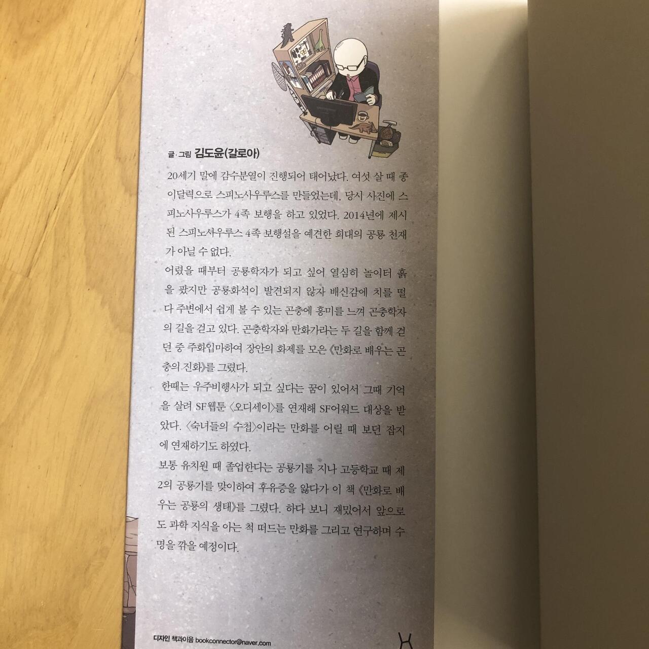 사실 <만화로 배우는 공룡의 생태>의 저자 김도윤은 곤충학자의 길을 걷고 있습니다. 그래서 곤충의 진화에 관한 책을 먼저 집필했죠. 그러나 어렸을때부터 좋아했던 공룡에 대한 추억을 간직하고 드디어 <만화로 배우는 공룡의 생태>를 출간하게 되었습니다.