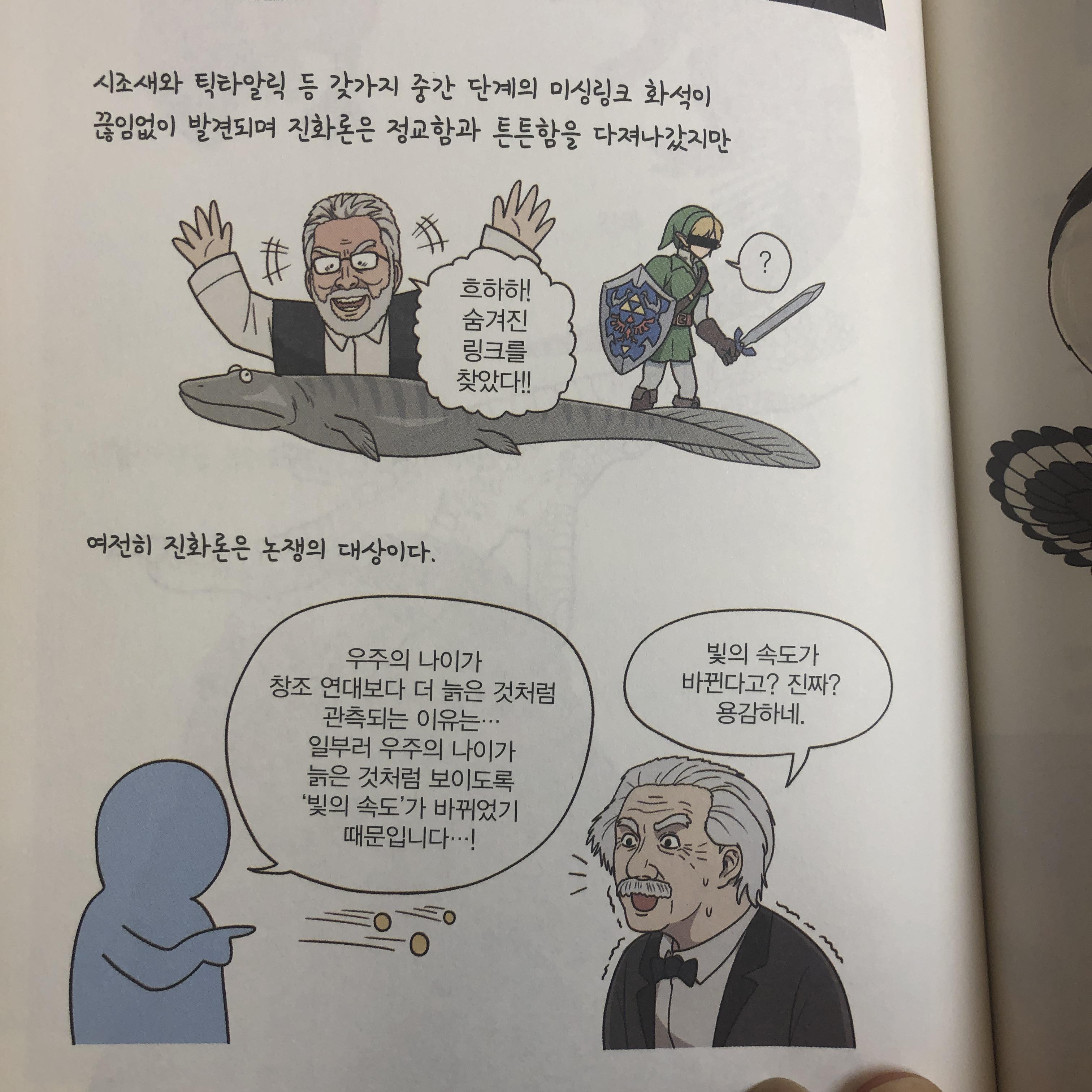 다윈과 아인슈타인이 등장하는 장면에 갑작스럽게 등장한 젤다의 전설 주인공 링크입니다. 미싱링크 화석에 관한 이야기를 언급하면서 등장한 것인데요. 그 이유는 바로 젤다의 전설 주인공 이름이 링크입니다. 아직 발표는 안되었지만 '젤다의 전설 더 미싱링크'를 벌써 3년째 제작중이니 언제가 이 게임이 출시가 되면, 그때 이 책을 읽는 독자들은 그 게임을 떠올리게 될 것 같네요.