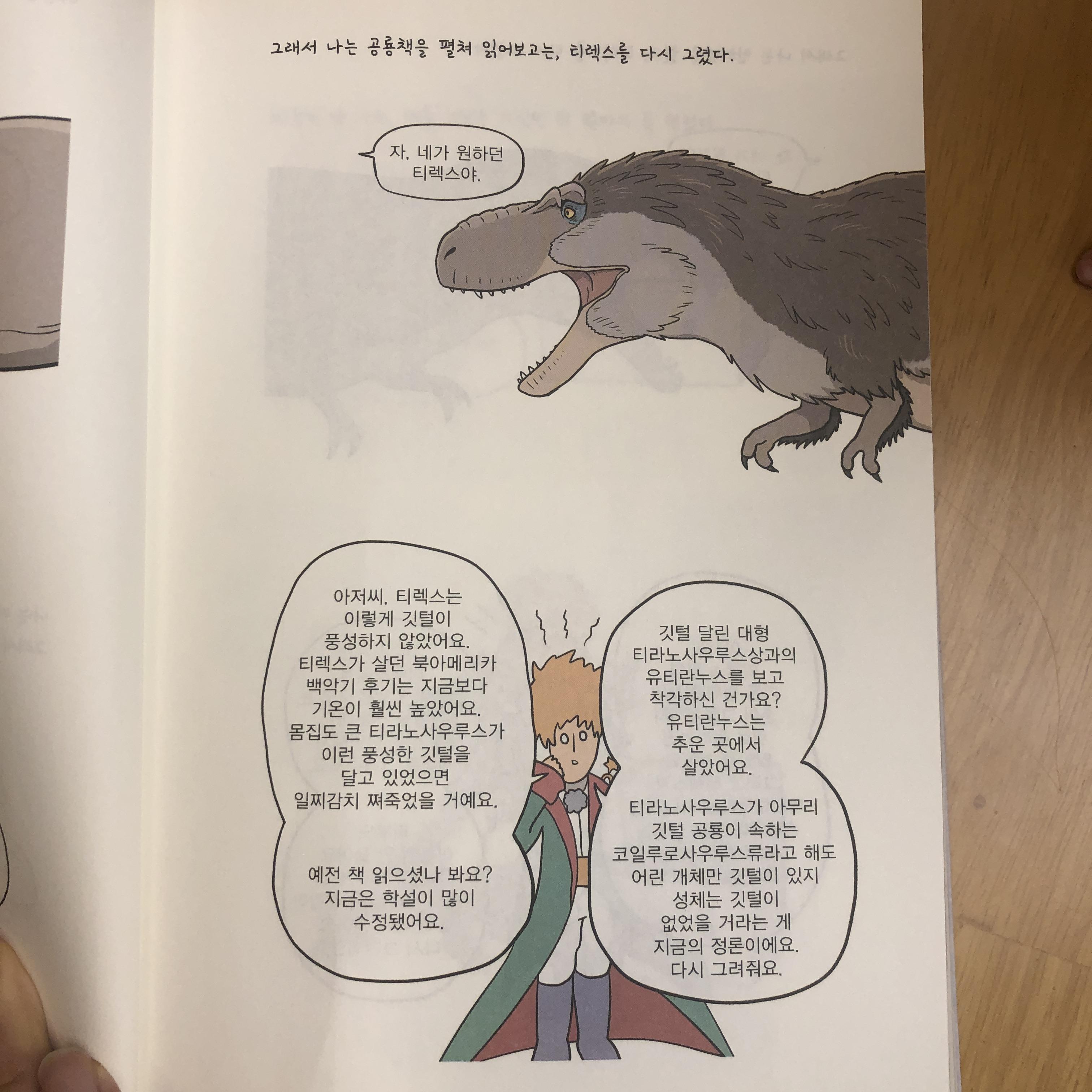 이 말처럼 저자 김도윤 역시 공룡으로 인해 곤충학자(과학자)가 되었을테니까요. 그런데 저는 <만화로 배우는 공룡의 생태> 첫 장을 보면서 깜짝 놀랐습니다. 바로 어린왕자와 저자의 티라노사우르스를 그리는 장면때문이었는데요.
