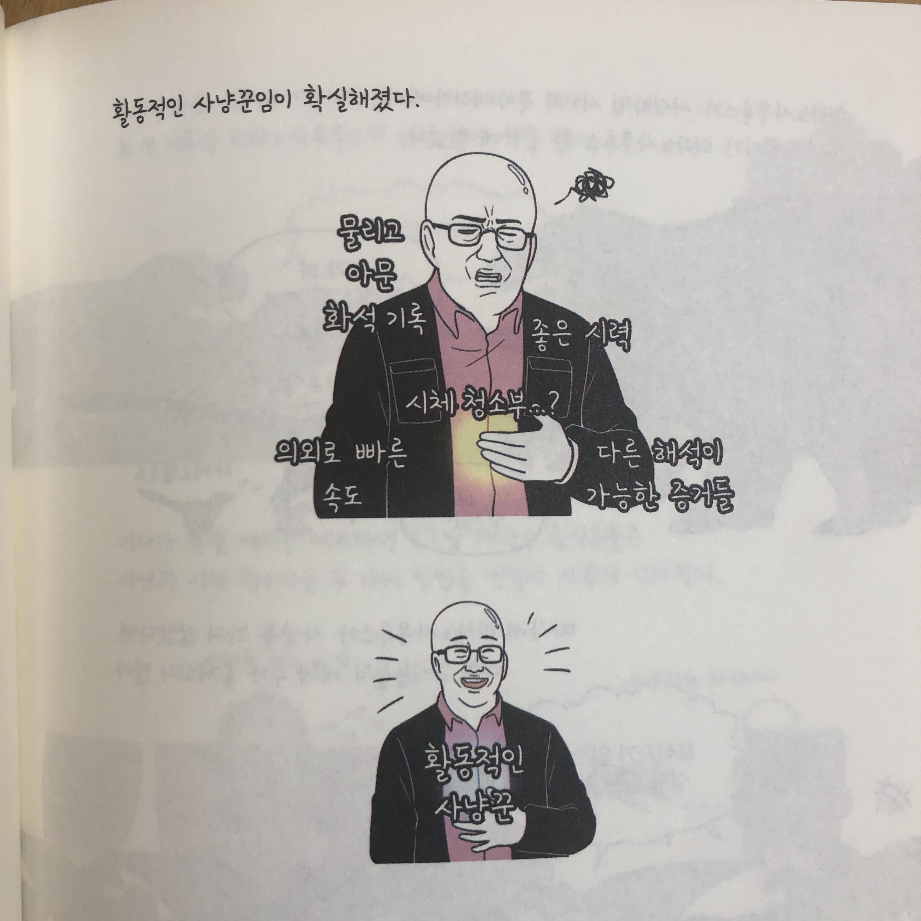 개비스콘 짤로 유명한 광고가 있습니다. 개비스콘이 무슨 약인지도 사람들은 모르지만, 개비스콘 짤은 너무나 유명하죠. 오죽하면 개비스콘 짤 생성기라는 프로그램이 웹에 있을 정도입니다. 아니나 다를까? <만화로 배우는 공룡의 생태>의 저자도 역시 개비스콘 광고를 패러디하고 있습니다. 자연스럽게 저자의 얼굴과 표정이 눈에 확 들어옵니다. 저자의 캐릭터를 이렇게 확대해서 그리니, 뭐랄까 저자 자신의 모습을 자화상으로 그린 것은 아닐까? 하는 생각도 들었습니다.