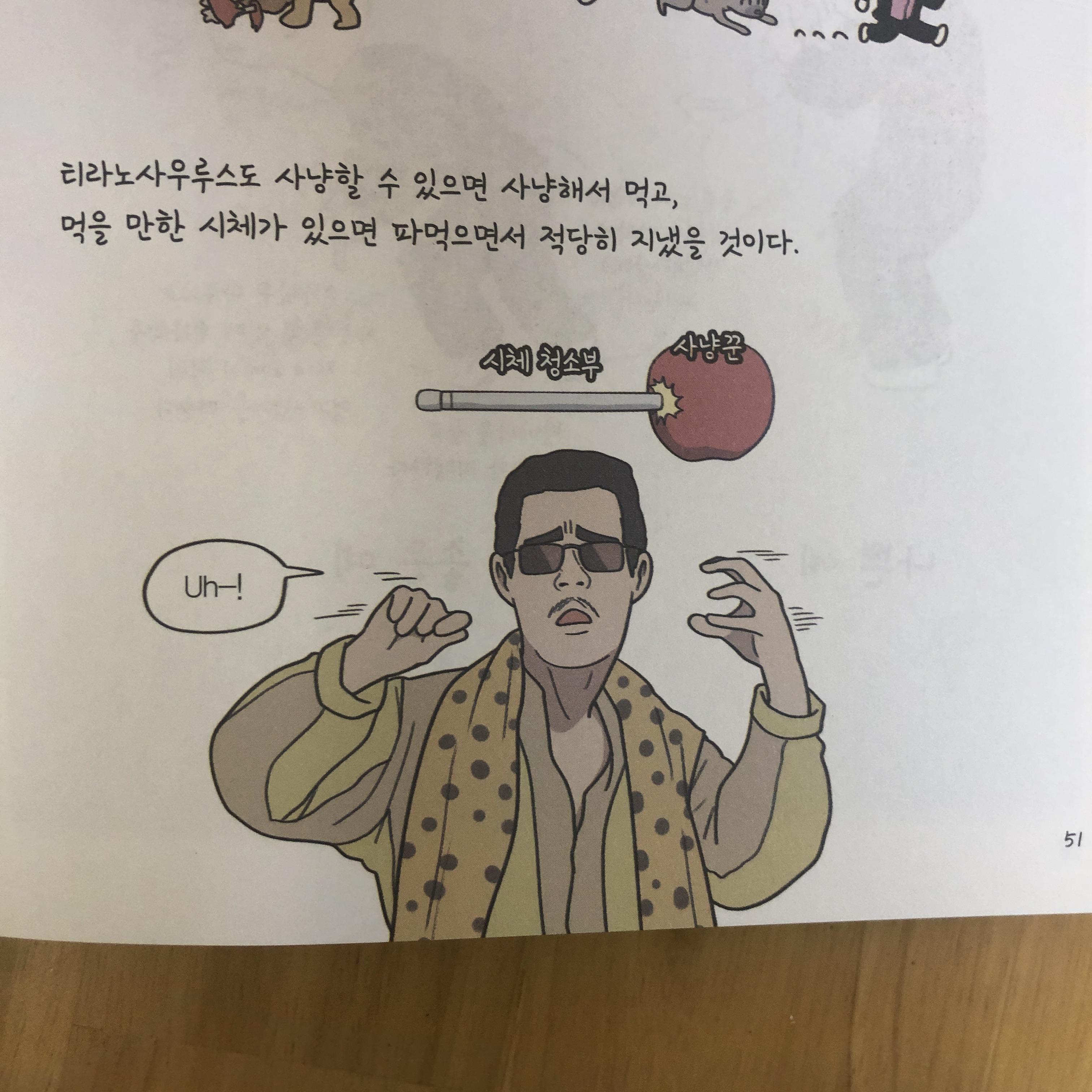 PPAP로 한때 엄청 유명세를 탔던 파인애플 아저씨가 있었습니다. 2016년즈음이었는데요. 무려 6년이나 지났네요. 요즘 어린 학생들은 잘 모를텐데요. 당연히 제 아들도 누군지 모릅니다. 그렇지만 20,30대라면 오랜만에 PPAP 파인애플 아저씨를 보면서 추억이 떠오를 것입니다. 이처럼 세대를 불문하고 여러 독자들에게 추억을 돋게 만드는 드립은 이 책의 재미를 더하여 줍니다.