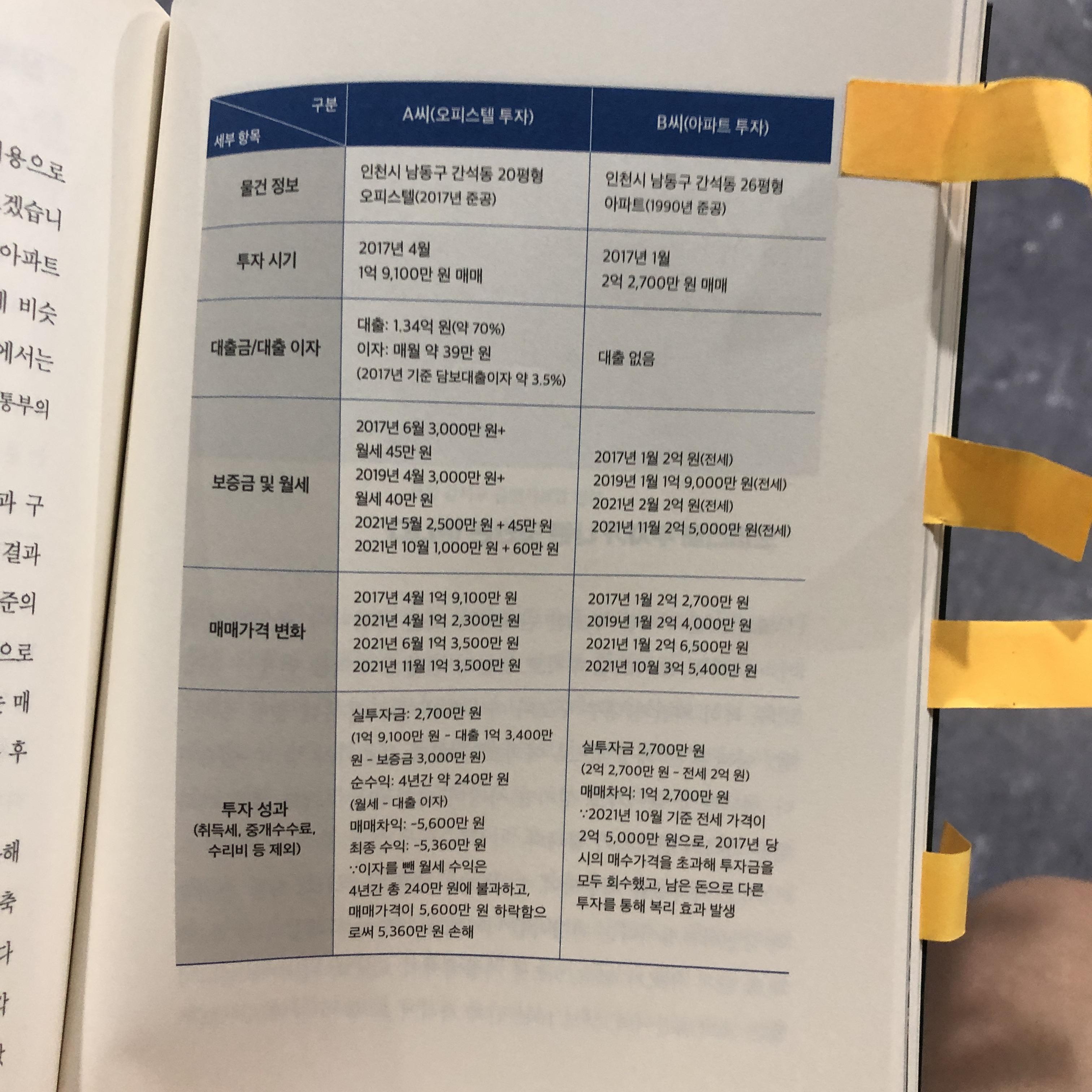 먼저 비슷한 투자 원금으로 비슷한 위치의 오피스텔과 아파트에 투자했던 사례 비교가 나옵니다. 왜 오피스텔 투자가 어려운지, 아파트 투자를 더 추천하는지 직관적으로 알 수 있습니다.