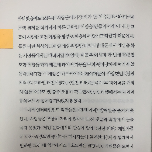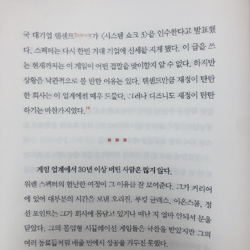 그러나 이 책은 어렸을적 저의 추억만을 상기시키는 추억팔이용 책은 아니었습니다. 제가 알지 못하는 게임 개발자의 영혼을 갈아넣는 삶, 그리고 EA로 대표되는 AAA(트리플 에이) 게임 제작사 및 유통사의 횡포, 그로 인해 떠도는 수많은 게임 개발자와 디자이너, 불안한 삶. 거기에 더하여 수많은 성공과 실패, 그리고 다시 이어지는 도전까지. 정말 게임 역사상 온전하게 드러나지 않았던 미시적인 역사, 말그대로 게임미시사를 제대로 다룬 게임역사서였습니다.