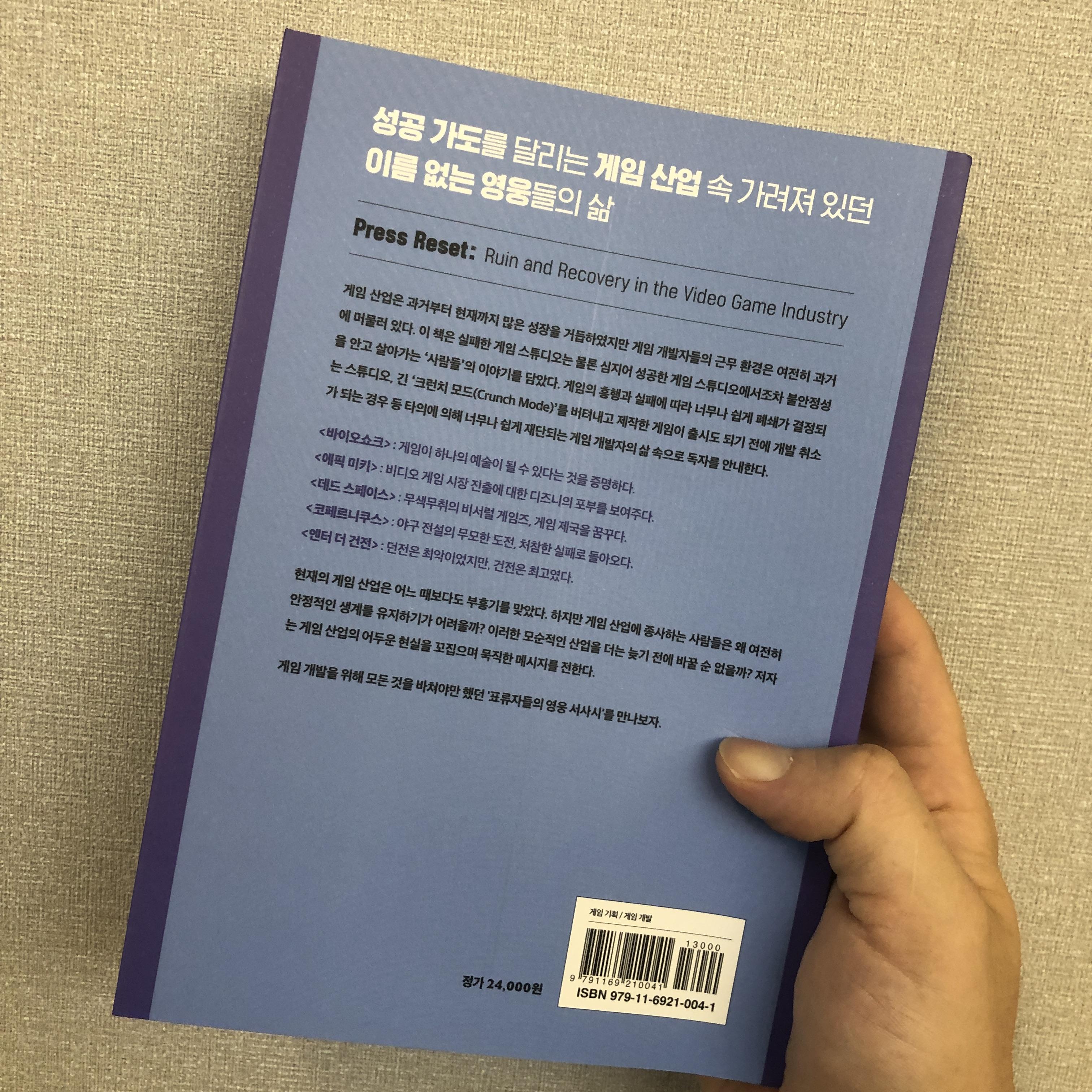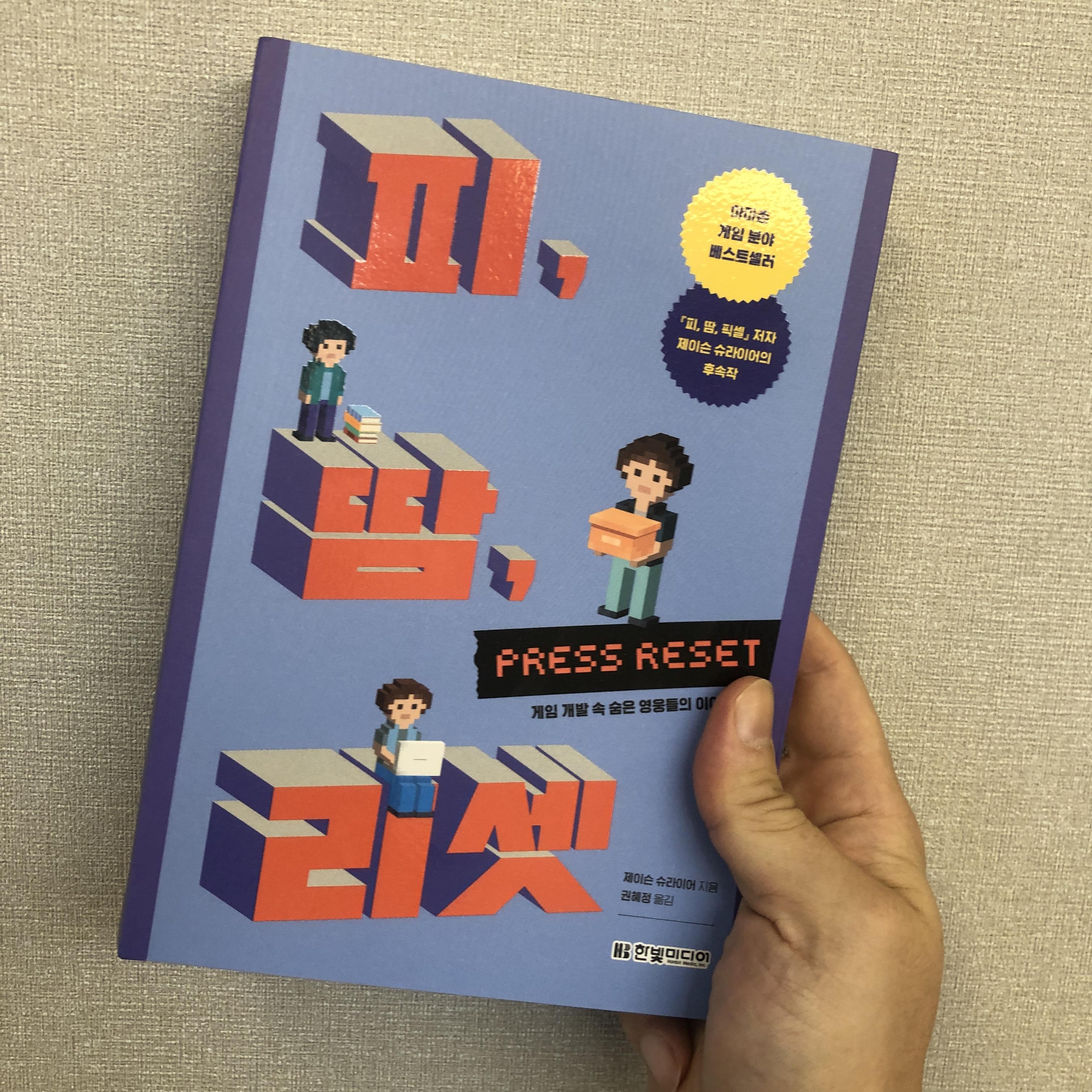 <피, 땀, 리셋>의 원제는 <PRESS RESET>으로 <피, 땀, 픽셀>의 저자 제이슨 슈라이어가 쓴 책이다. 사실 <피, 땀, 픽셀>의 원제는 말그대로 <Blood, Sweat, and Pixels>이지만, <피, 땀, 리셋>의 원제에는 피와 땀은 들어가 있지 않습니다. 하지만 피, 땀 그 이상으로 갈아져 가는 수많은 게임 개발자의 눈물이 <피, 땀, 리셋>에는 들어가 있기에 충분히 의미있는 제목이지 않나 싶습니다.