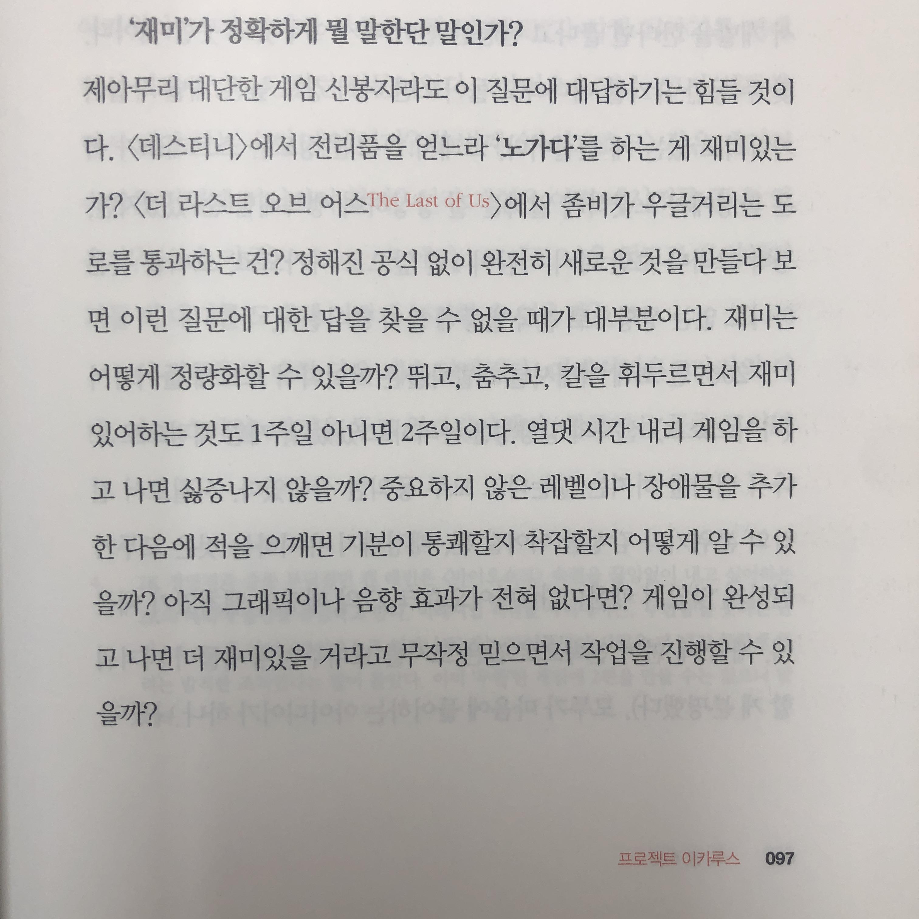 게임은 예술과 과학 사이에 걸쳐있어 기술 발전과 '재미를 찾는' 도전이 함께 이루어져야 하기에, 일정을 칼같이 맞추는게 불가능에 가깝다는 것이었다. -<피, 땀, 리셋> 14쪽