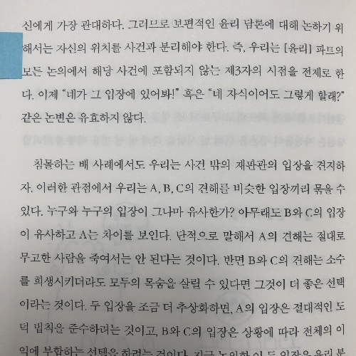 보편적 윤리 담론에서 자신의 위치를 사건과 분리해야 합니다. 제3자의 시점을 전제로 해야 한다는 것이죠.