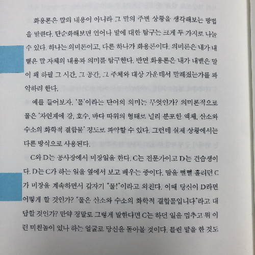 저자는 아주 흥미로운 예를 드는데요. C와 D가 공사장에서 일을 하는데, 사수C가 D에게 물!하고 외칩니다. 무슨 뜻일까요? 더우니 물을 가져오라는 것이겠죠. 이것을 통해 화용론을 아주 단순하게 설명합니다. 의미가 확 와닿습니다.