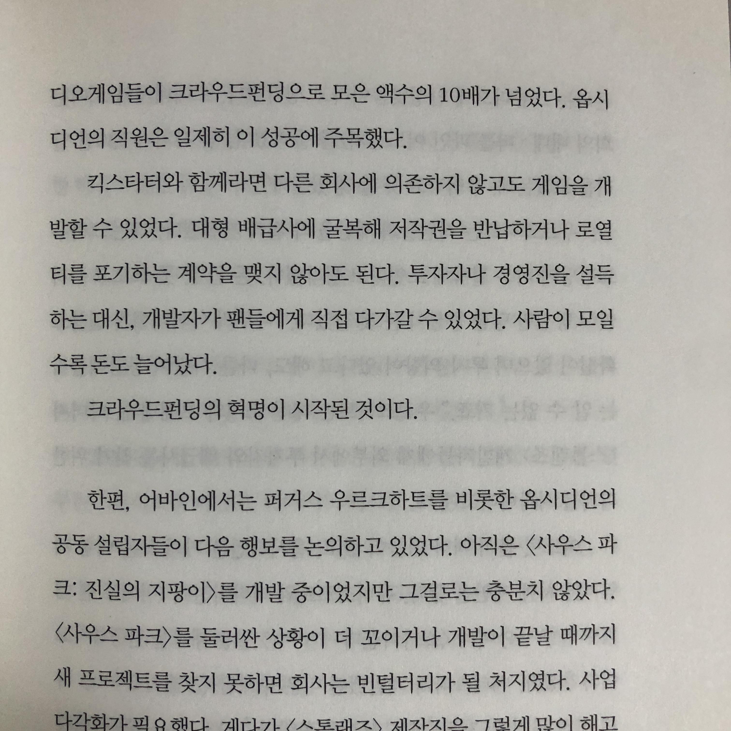 킥스타터와 함께라면 다른 회사에 의존하지 않고도 게임을 개발할 수 있었다. 대형 배급사에 굴복해 저작권을 반납하거나 로열티를 포기하는 계약을 맺지 않아도 된다. 투자자나 경영진을 설득하는 대신, 개발자가 팬들에게 직접 다가갈 수 있었다. 사람이 모일수록 돈도 늘어났다. 크라우드펀딩의 혁명이 시작된 것이다.