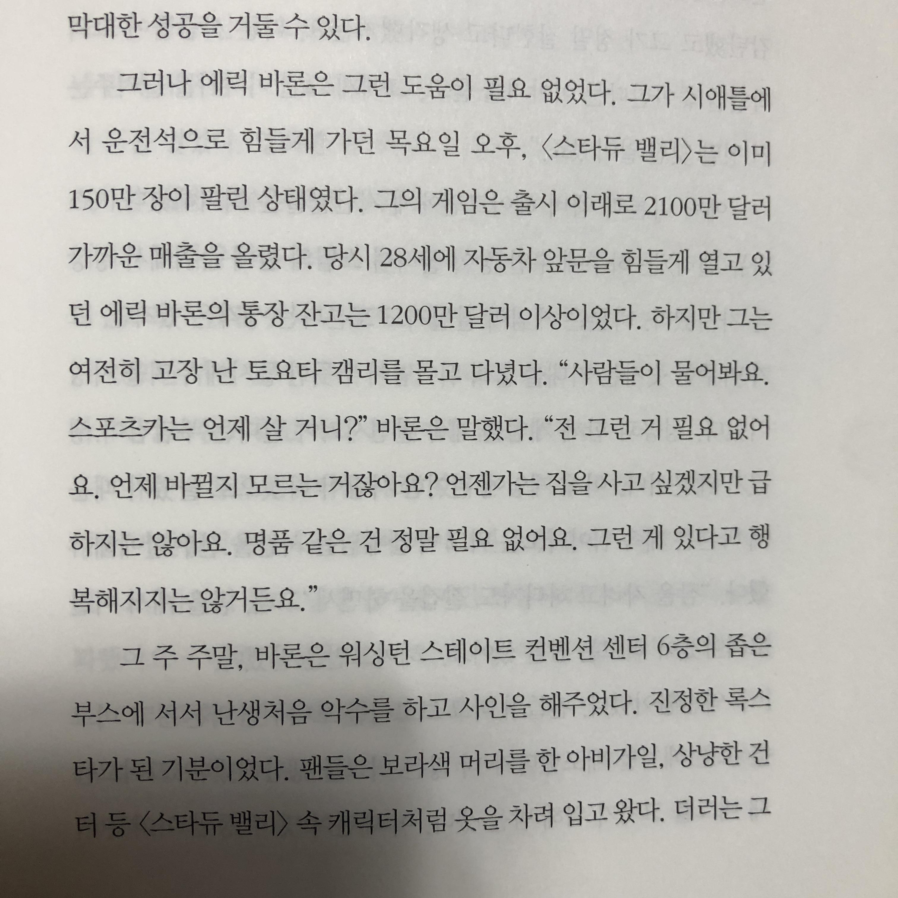 <스타듀 밸리>는 이미150만장이 팔린 상태였다. 그의 게임은 출시 이래로 2100만 달러 가까운 매출을 올렸다. 당시 28세에 자동차 앞문을 힘들게 열고 있던 에릭 바론의 통장 잔고는 1200만 달러 이상이었다. 하지만 그는 여전히 고장 난 토요타 캠리를 몰고 다녔다. “사람들이 물어봐요.