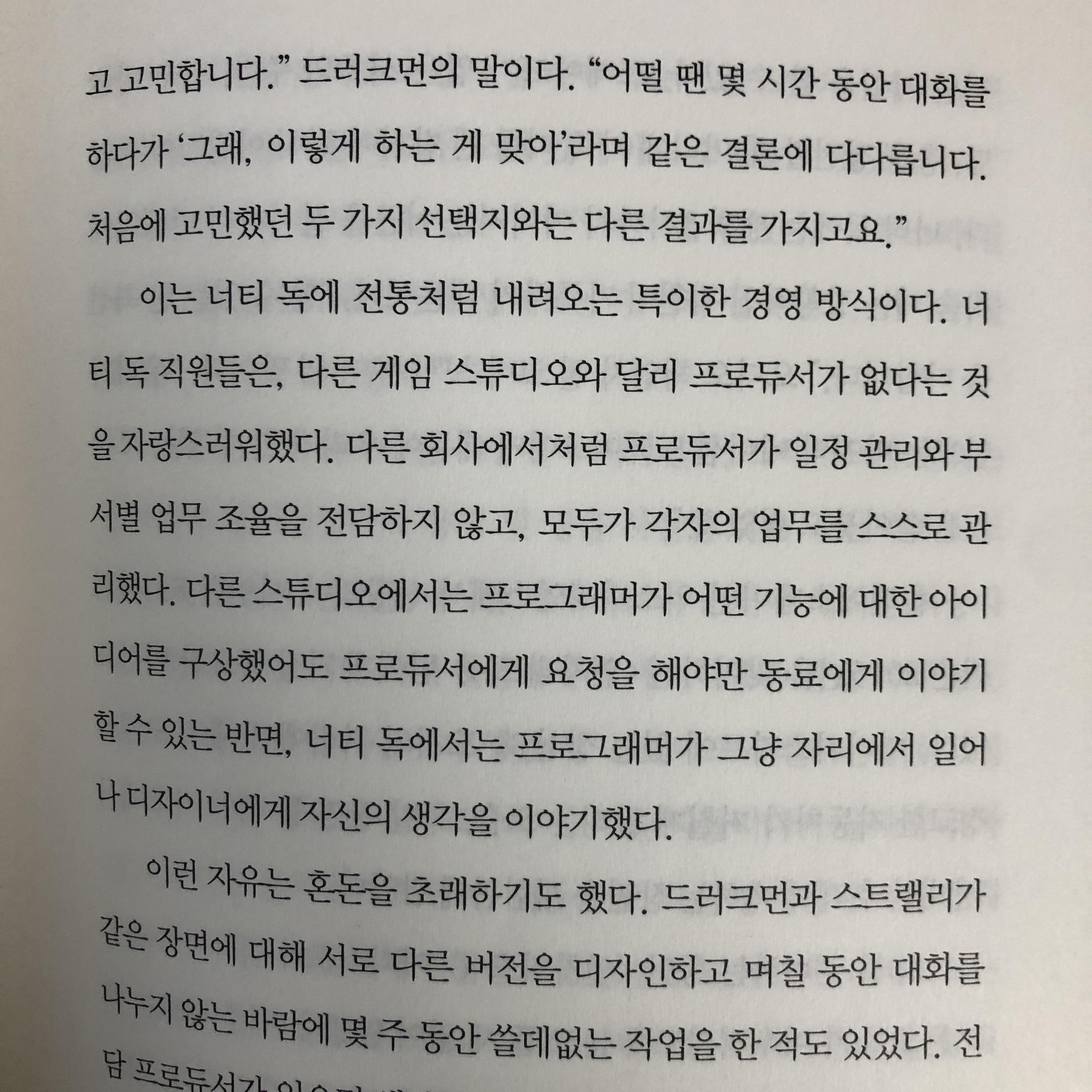 그러나 <언차티드4>를 제작한 너티 독은 프로듀서가 일정관리나 업무조율을 하지 않았습니다. 조금더 개별 팀의 자율권과 재량권을 허용한 것이었죠. 물론 비효율을 초래하는 단점도 있었습니다. 같은 장면을 서로 다른 버전으로 무려 3주 이상을 각각 만들면서 헛된 시간을 소모하게 된 것처럼 말이죠.