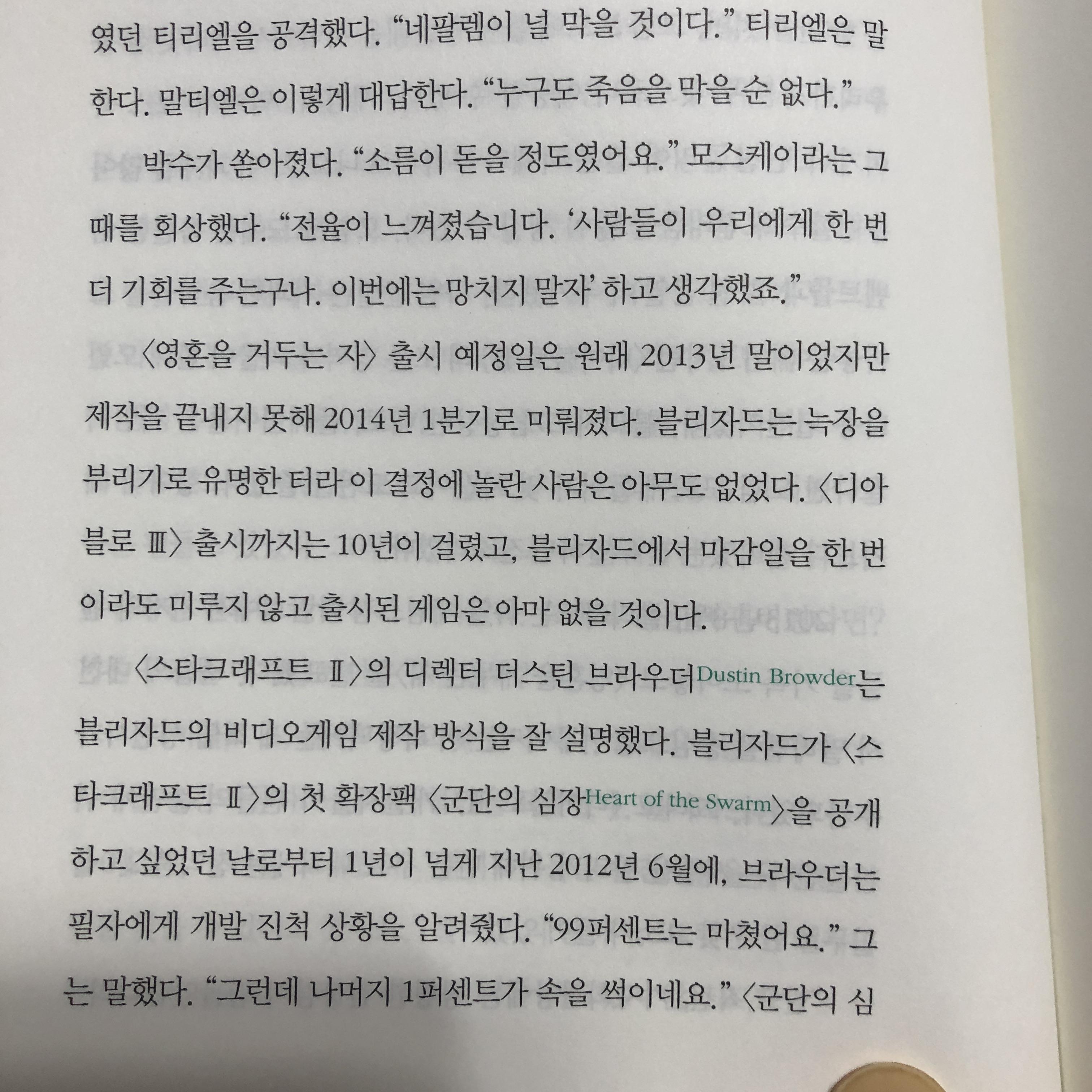 블리자드가 <스타크래프트 II>의 첫 확장팩 <군단의 심장Heart of the Swarm>을 공개하고 싶었던 날로부터 1년이 넘게 지난 2012년 6월에, 브라우더는 필자에게 개발 진척 상황을 알려줬다. "99퍼센트는 마쳤어요." 그는 말했다. "그런데 나머지 1퍼센트가 속을 썩이네요."