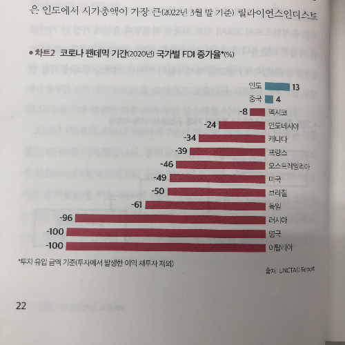 2020년 코로나 팬데믹 기간 국가별 FDI 증가율 차트인데요. 보시는 것처럼 코로나 팬데믹이 한창일 때 외국인직접투자의 순증을 보인 국가는 딱 두 군데입니다. 바로 중국과 인도인데요. 그외의 국가들은 대부분 감소를 했습니다. 특히 영국과 이탈리아는 -100%라는 사상 초유의 감소를 기록했습니다.