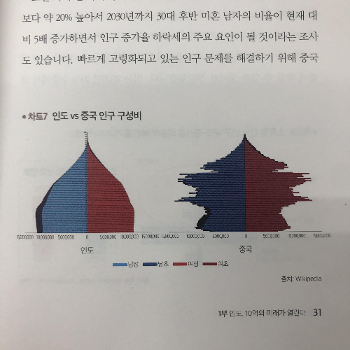 <10억이 열린다>의 김민수 작가는 다양한 자료로 인도투자는 끝물이 아니고, 이제 시작이라는 주장을 하는데요. 다양한 데이터로 그 근거를 매우 구체적으로 제시합니다. 그 중 하나가 바로 인도와 중국의 인구 구성비입니다.
