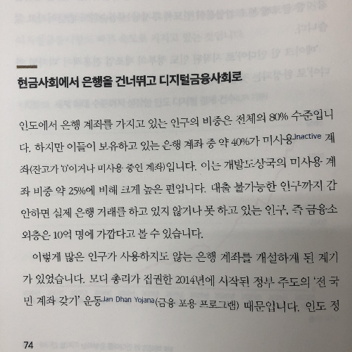 인도에서 은행 계좌를 가지고 있는 인구의 비중은 전체 80% 수준입니다. 하지만 이들이 보유하고 있는 은행 계좌 중 약 40%가 미사용 계좌입니다. 이는 개발도상국의 미사용계좌 비중 약25%에 비해 크게 높은 편입니다. 대출 불가능한 인구까지 감안하면 실제 은행 거래를 하고 있지 않거나 못 하고 있는 인구, 즉 금융소외층은 10억 명에 가깝다고 볼 수 있습니다. -<10억이 열린다> 74쪽