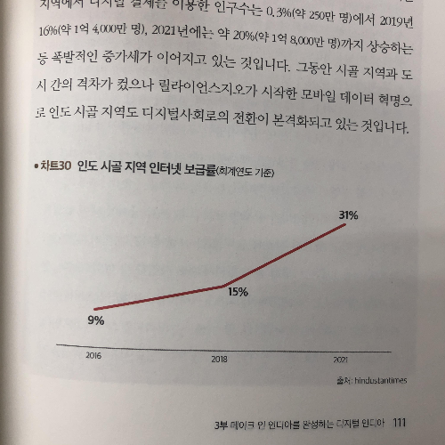 2016년 인도 시골 지역 인구 대부분은 2G에 의존하고 있었습니다. 전체 시골 인구 중 모바일 인터넷 접속이 가능했던 비중은 약9%수준이었습니다. 하지만 이 비중은 2016년 릴라이언스지오의 모바일브로드밴드 서비스 론칭 이후 2018년 15%, 2021년 31%까지 가파르게 상승했습니다. -<10억이 열린다> 111쪽