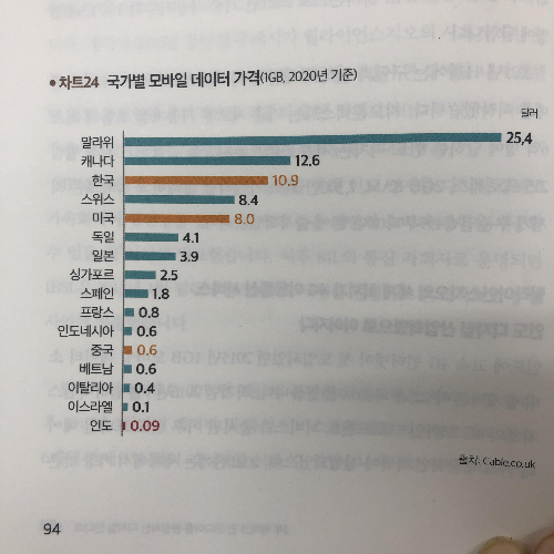 <10억이 열린다>에서 제시하는 위 차트를 보면서 깜짝 놀랐습니다. 인도는 1GB 모바일 데이터 가격이 전세계에서 가장 저렴한 나라였던 것입니다. 무려 1GB에 0.09달러입니다.