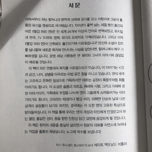실제로 <빨강머리 앤>의 원작자인 루시 모드 몽고메리의 손녀 케이트 맥도날드 버틀러는 문학툰 <빨강머리 앤>의 서문에서 다음과 같이 말합니다.