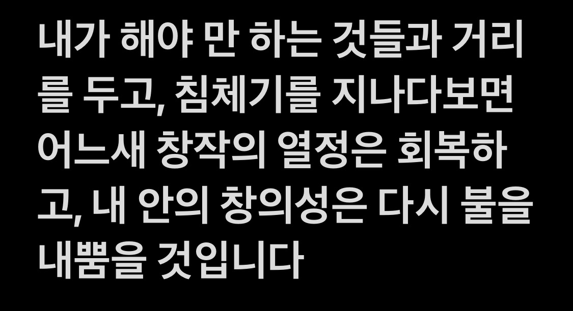 내가 해야 만 하는 것들과 거리를 두고, 침체기를 지나다보면 어느새 창작의 열정은 회복하고, 내 안의 창의성은 다시 불을 내뿜을 것입니다. 오늘도 힘겨운 창작의 고통을 이겨내는 모든 크리에이터분들을 응원합니다. 감사합니다.
