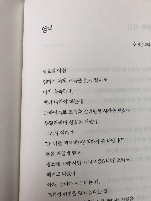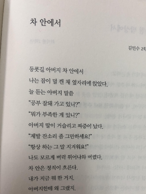 이러한 부산연제고 학생들의 학생시 작품을 읽으면서 느끼는 것은, 부모나 가족에게 짜증내는 것은 그리고 미안해하는 것은 세대와 지역을 넘어서 공통적인 현상이구나라는 것입니다.