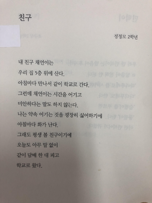 <생긴 대로 살아야지> 시집에서 가장 마지막으로 살펴 볼 작품은 바로 정정모 학생의 친구입니다.