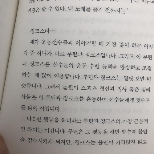 루틴과 징크스의 차이를 참으로 간명하게 설명하고 있는데요. 결국 작업 능력의 효율을 높이는 것이 루틴이라면, 효율을 떨어트리는 것이라면 징크스라고 한덕현님은 <답답해서 찾아왔습니다>에서 밝히고 있습니다.