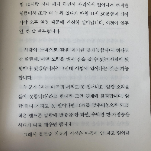 한덕현님은 본문에서 말합니다. 하나도 안 졸린데 어떻게 억지로 잘 수 있겠냐고요. 그렇기 때문에 억지로 자려고 하는 것이 아니라 억지로 아침에 일어나야 한다고 말합니다.