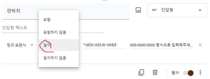 그리고 복잡한 수식인 정규표현식 기능까지 사용한다면 훨씬 더 구글 폼(구글 설문지)에서 설문 제작 수집자가 원하는 방식과 형식대로 구조화된 응답을 받을 수 있습니다.