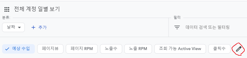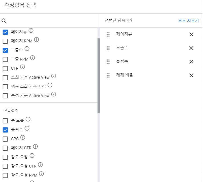 측정항목을 선택할 수 있습니다. 저는 페이지뷰, 노출수, 클릭수, 게재 비율을 선택했습니다.