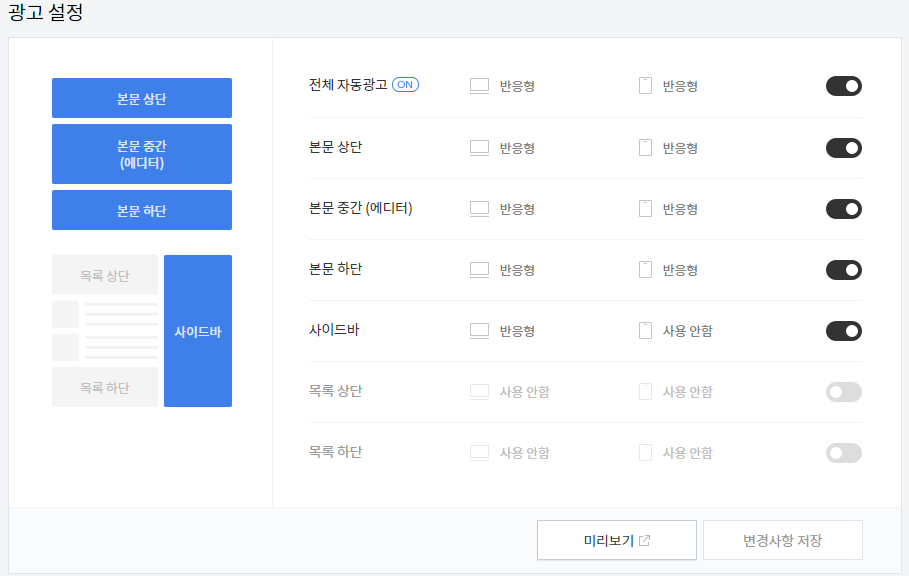 이 태그를 입력하면 광고 설정에서 목록 상단과 하단 설정을 아래와 같이 할 수 있습니다.
