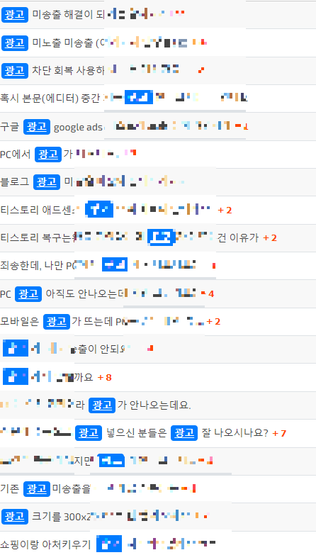 애드센스 관련하여 애드센스포럼이 있는데, 이곳에서 블로그 운영자들의 글 중에서 광고 키워드로 검색을 해보니 이렇게나 많은 분들이 광고 미송출 문제를 겪고 있었습니다.