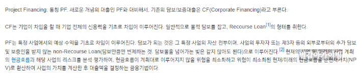 이를 통해 사업 프로젝트 자산 전체를 담보하여 꽤 오래 기간 동안 안정적으로 자금을 대출하는 것을 뜻합니다.