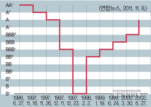위 그래프에서 알 수 있듯이 IMF사태가 발발했던 1997년 한국의 국가신용등급은 급격하게 낮아집니다.