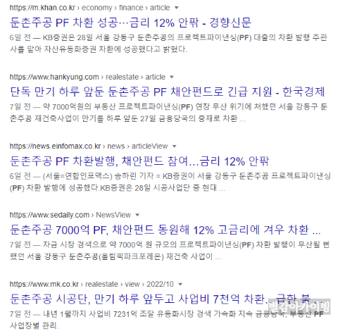먼저 구글에서 둔촌주공pf로 검색하면 나오는 기사 목록입니다.
