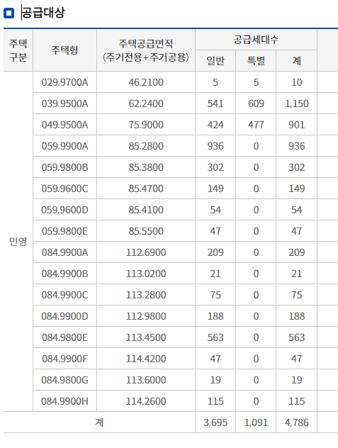 거기에 일반공급은 3,695세대고 특별공급은 1,091세대인데요.
