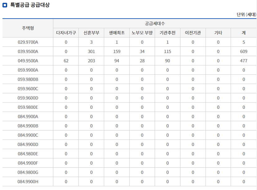 표에서 볼 수 있듯이 우선 49m2까지만 특공에 배정되었습니다.