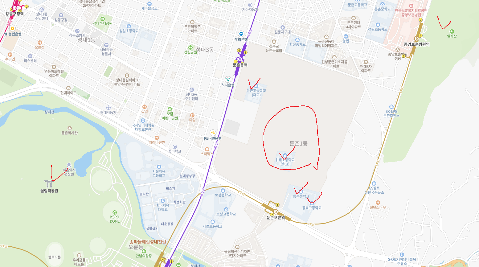 5호선 둔촌동역과 9호선 둔촌오륜역 사이에 껴있기 때문에 5호선으로는 서울도심지(종로권)와 강남, 여의도까지 모두 접근이 수월합니다.
