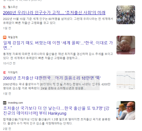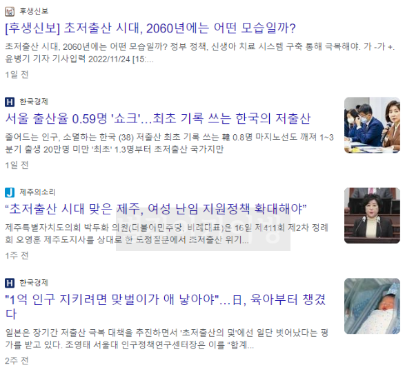 초저출산을 키워드로 검색하면 다음과 같은 기사들이 검색이 됩니다.
