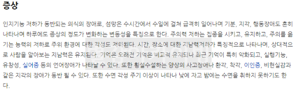 제가 초등학생때 돌아가신 저희 할머니께서 겪으셨던 증상이 바로 섬망이었는데요. 그때는 섬망인지 잘 모르고 그저 치매라고만 생각했는데, 사실은 치매와 섬망은 다른 것이라는 것을 알았습니다.