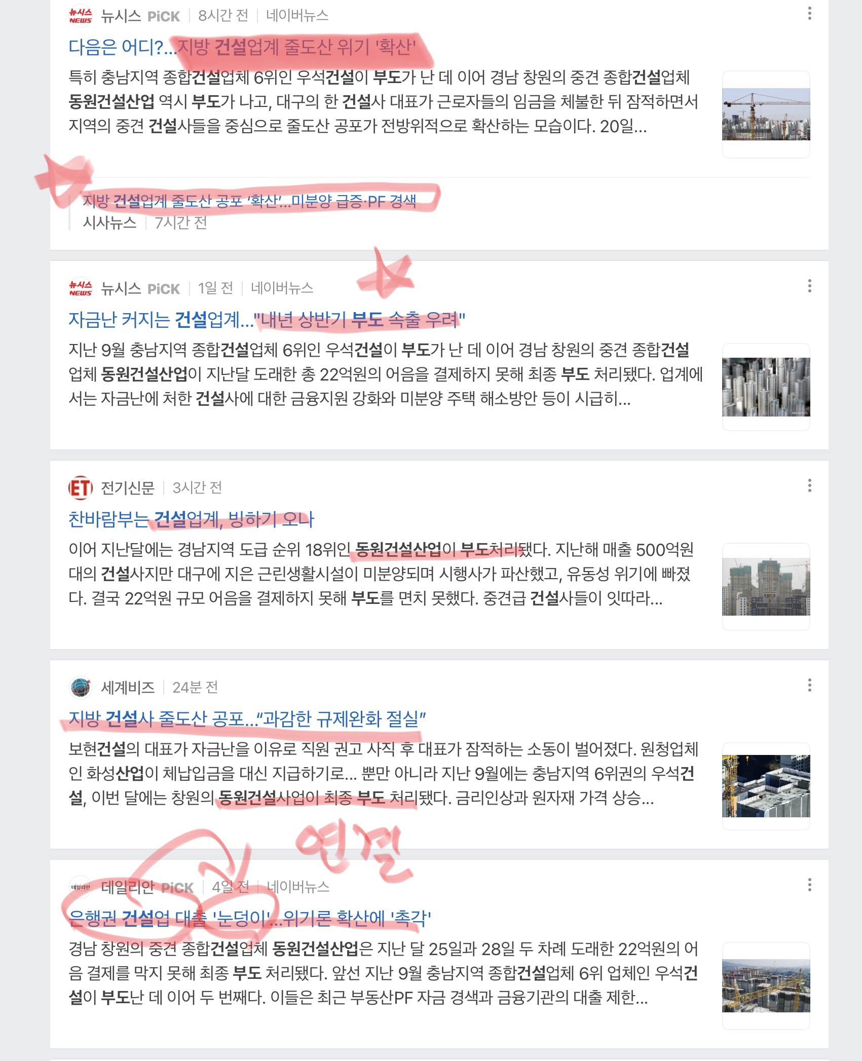 건설업계 부도설 심상치 않습니다.