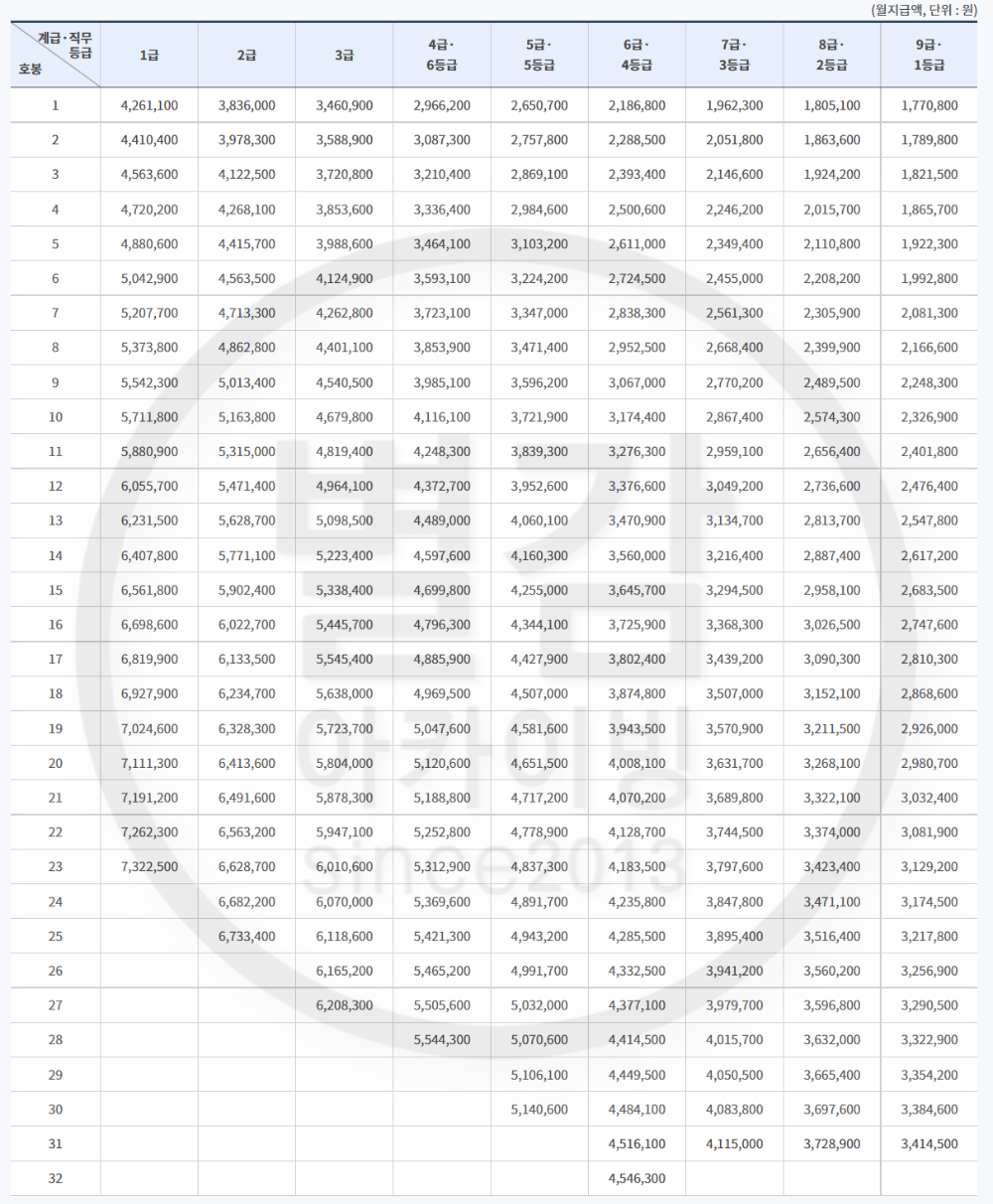 그래서 이 표를 보면 자신의 급수와 호봉에 따라서 받는 본봉을 확인할 수 있습니다. 이 본봉에 각종 수당을 합치면 바로 월급이 되는 것이죠. (물론 월급에서 각종 공제액을 감해야 하지만요)