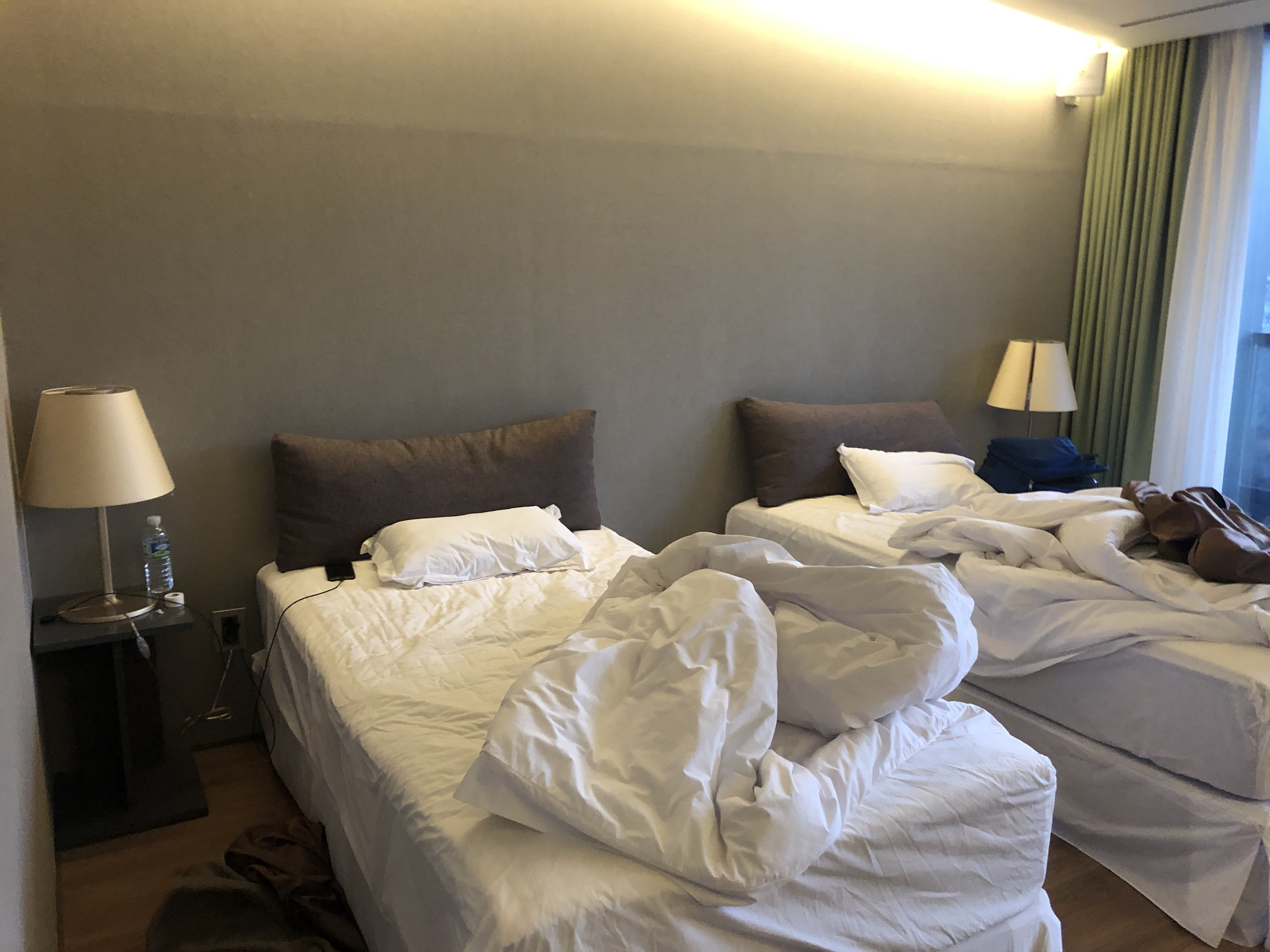 숙소를 나올 때 찍은 사진이어서 침구류가 어지럽습니다만, 침대는 싱글 침대 2개가 편성되어 있습니다.